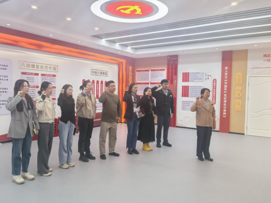全体党员面向党旗庄严宣誓,重温入党誓词,铿锵有力的誓言表达了党员们坚守初心、永葆政治本色的坚定决心。随后,在支部纪检委员的引导下,党员们依次参观“党的纪律建设百年历程”、“中央八项规定精神及其深远影响”、“《中国共产党廉洁自律准则》”“学校领导干部‘十不准’规定”等专题展区,系统回顾党在不同历史时期加强纪律建设的重大举措,深入了解新时代全面从严治党取得的丰硕成果。